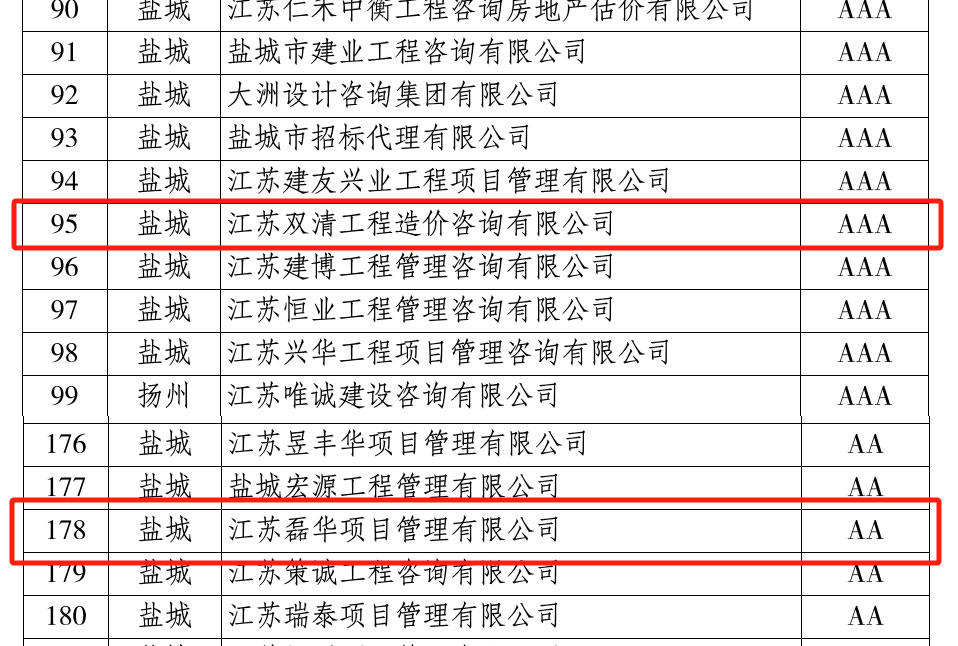 江蘇磊華項(xiàng)目管理有限公司獲得省AA級招標(biāo)代理信用評價、江蘇雙清工程造價咨詢有限公司獲得省AAA級招標(biāo)代理信用評價